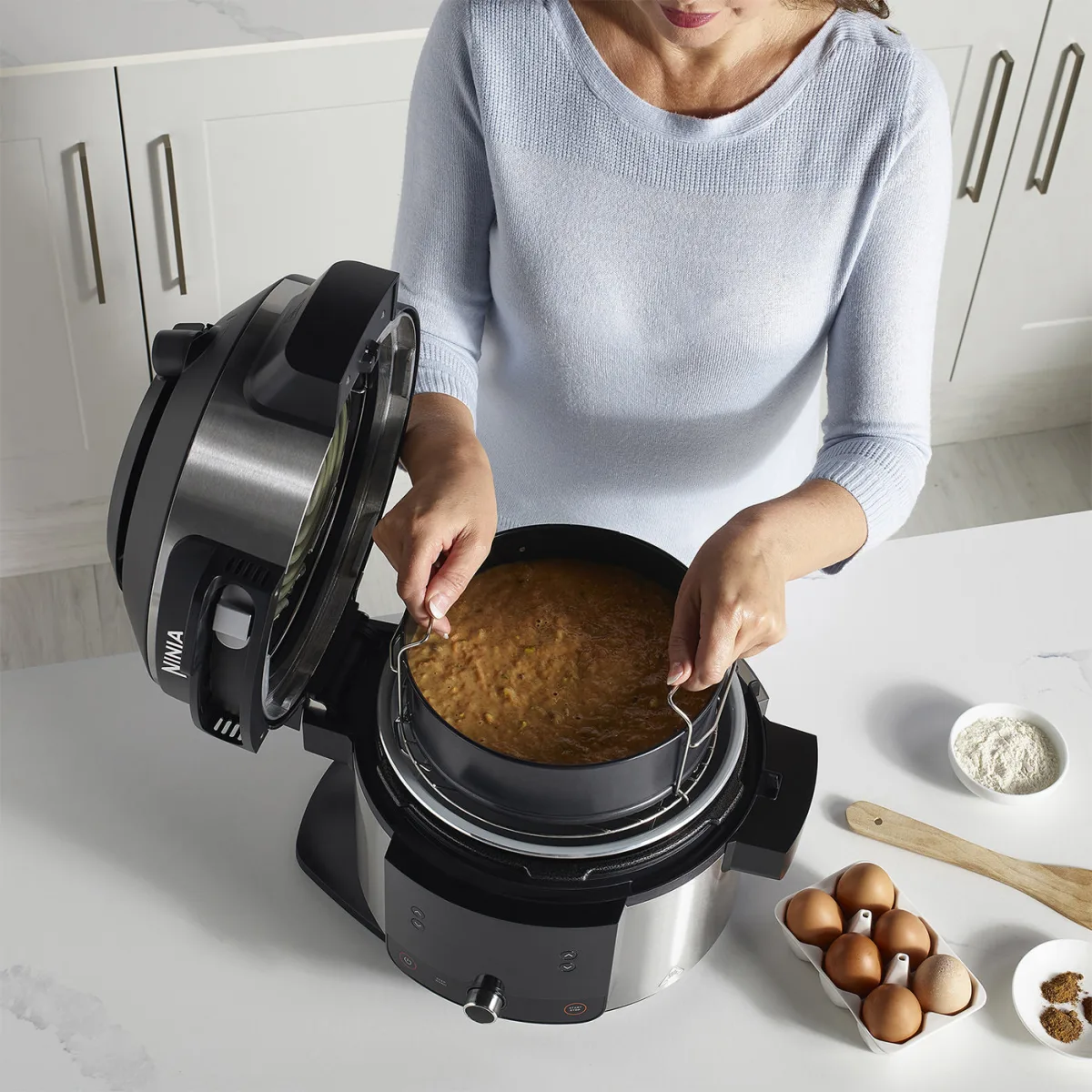 Introducing an exclusive bundle featuring the Ninja Foodi 11-in-1 SmartLid Multi-Cooker and 3 extra accessories: a Loaf Tin, heat-resistant Silicone Mitts and a signature Ninja Apron.