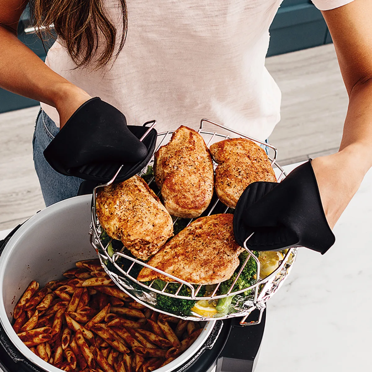 Includes a 6L non-stick ceramic-coated Cooking Pot which fits up to a 2kg roast, a 3.7L non-stick ceramic coated Cook & Crisp Basket which fits 1.1kg of French fries, and a single-tier rack – perfect for layering ingredients to mains and sides at the same time, or raising food for steaming, baking and grilling.